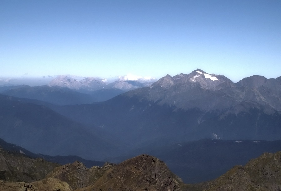 Панорама с вершины безупречна, погода идеальная, облачка добавляют свой колорит, все вершины видны, правда не все узнаваемы, ведь мы первый раз здесь... Прямо перед нами Агепста - цель нашего похода!