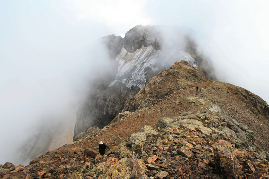 Идём дальше прямо по скальному гребню и сыпухе, вершина уже видна! И вот первый взошёл Дэн (Белый ходок) уже на вершине!